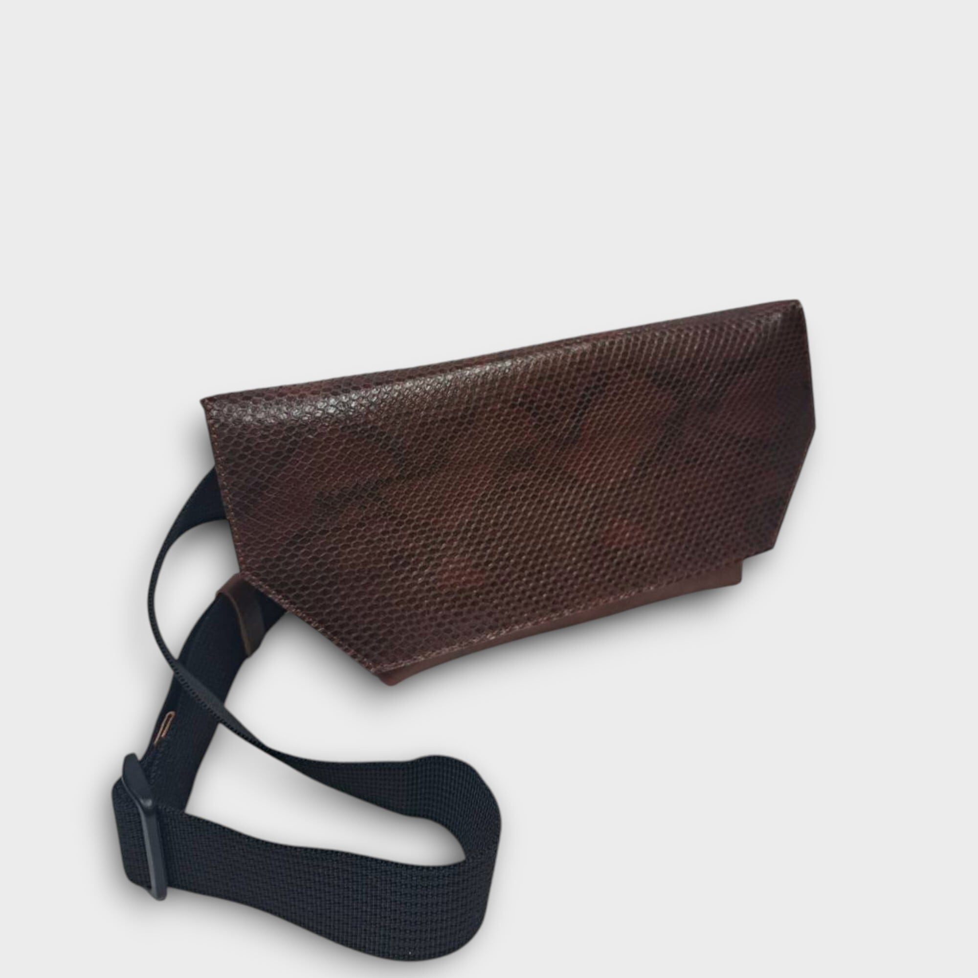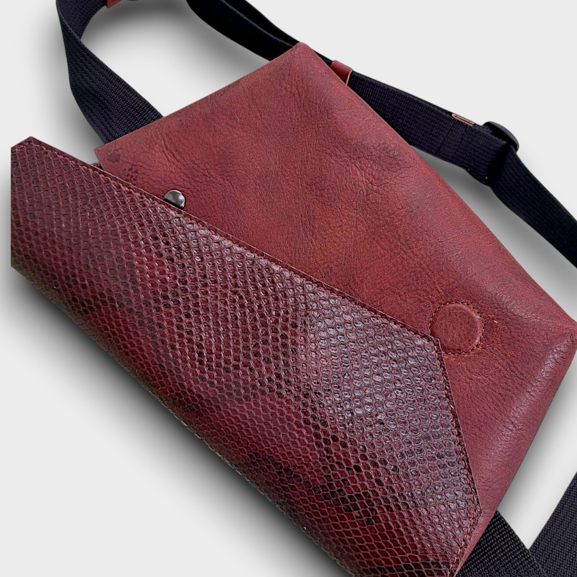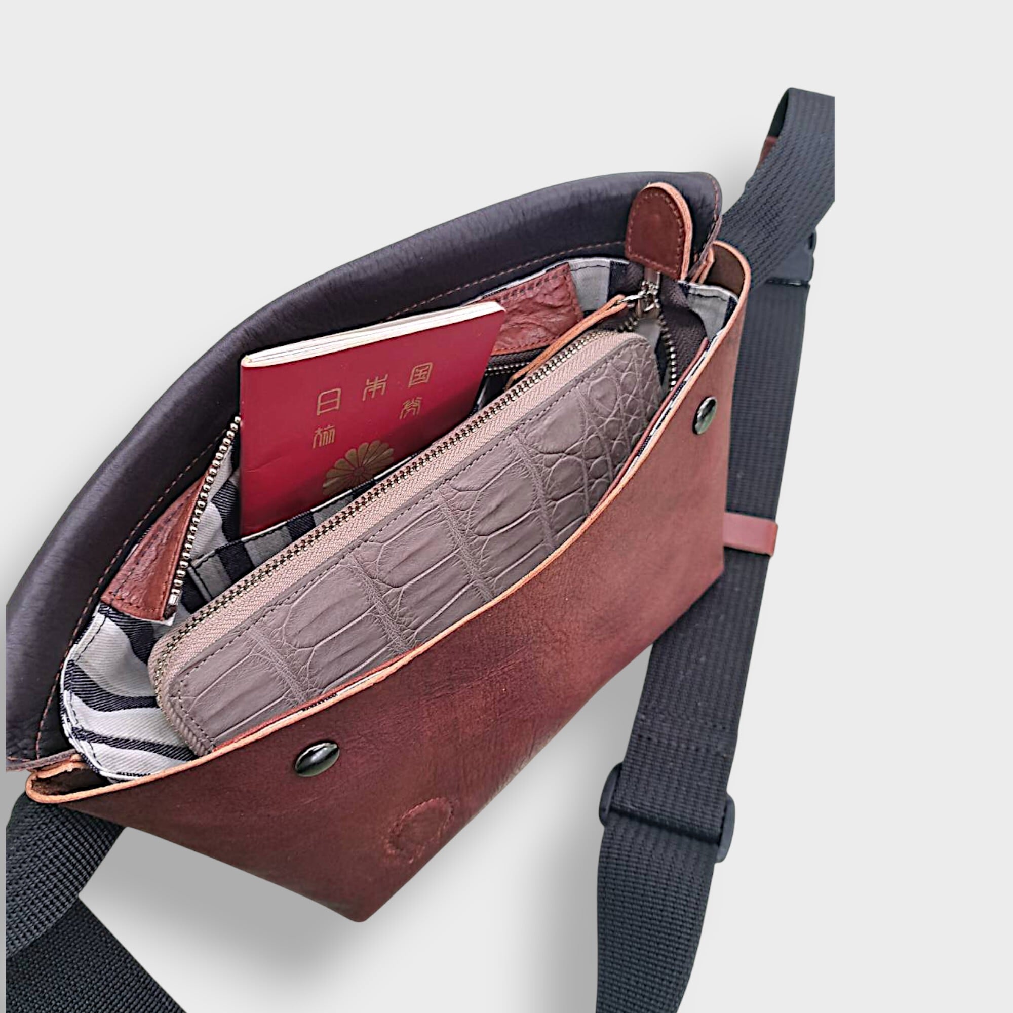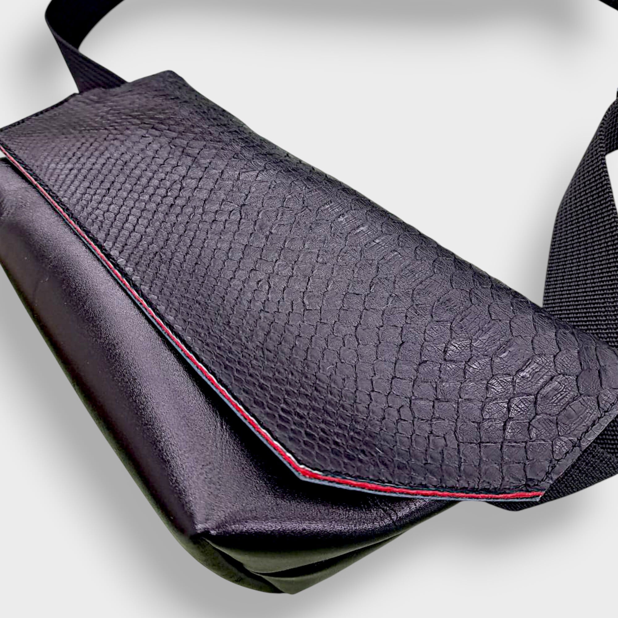 パイソンレザーのフタ × 牛革ボディのボディバッグ。