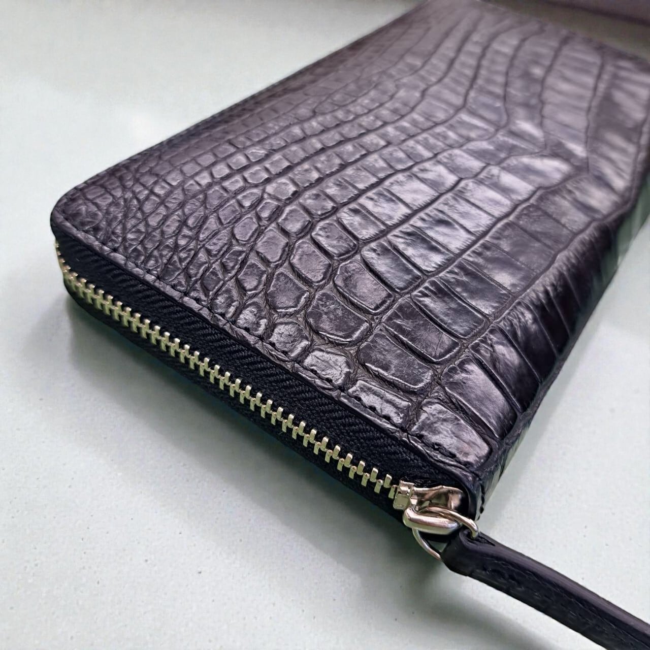 本品は、クロコダイル革を贅沢に「一枚取り」で仕立てており、素材の持つ迫力と格調を余すことなく引き出しています。